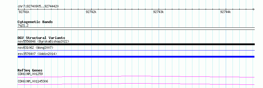 | | Variant Type | CNV gain | | Copy Number | | | Allele State | | | Allele Origin | | | Probe Count | | | Validation Flag | | | Merged Status | M | | Merged Variants | | | Supporting Variants | essv9784395, essv9784396, essv9784398, essv9784397, essv9784394 | | Samples | 401820SD, 400131CM, 400793BR, 401943KA, 401365DJ | | Known Genes | CDK6 | | Method | SNP array | | Analysis | We used four separate algorithms to detect CNVs; Affymetrix Chromosome Analysis Suite (ChAS), iPattern, Nexus and Partek. Our primary analysis was performed based on ChAS CNV calls, which were then supported using the remaining three algorithms to construct a confidence set of CNVs. For all algorithms, we have used 8 probes and >1kb as a base line cutoff for CNV detection. | | Platform | Affymetrix CytoScan HD 2.7M array | | Comments | | | Reference | Uddin_et_al_2014 | | Pubmed ID | 25503493 | | Accession Number(s) | esv3576407