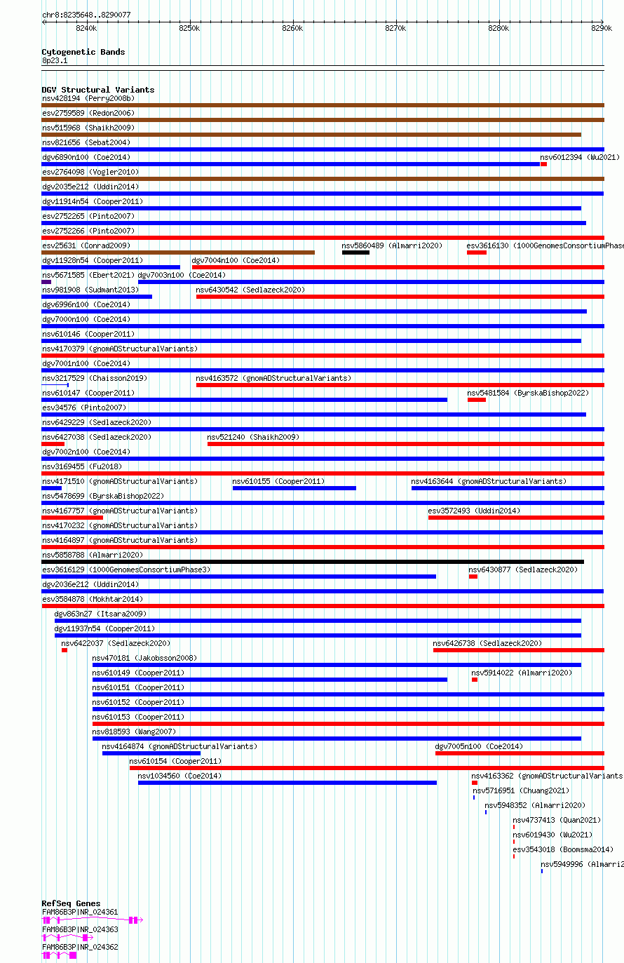 Variant DetailsVariant: esv3576518 | Internal ID | 18704716 | | Landmark | | | Location Information | | | Cytoband | 8p23.1 | | Allele length | | Assembly | Allele length | | hg38 | 54430 | | hg19 | 54430 |