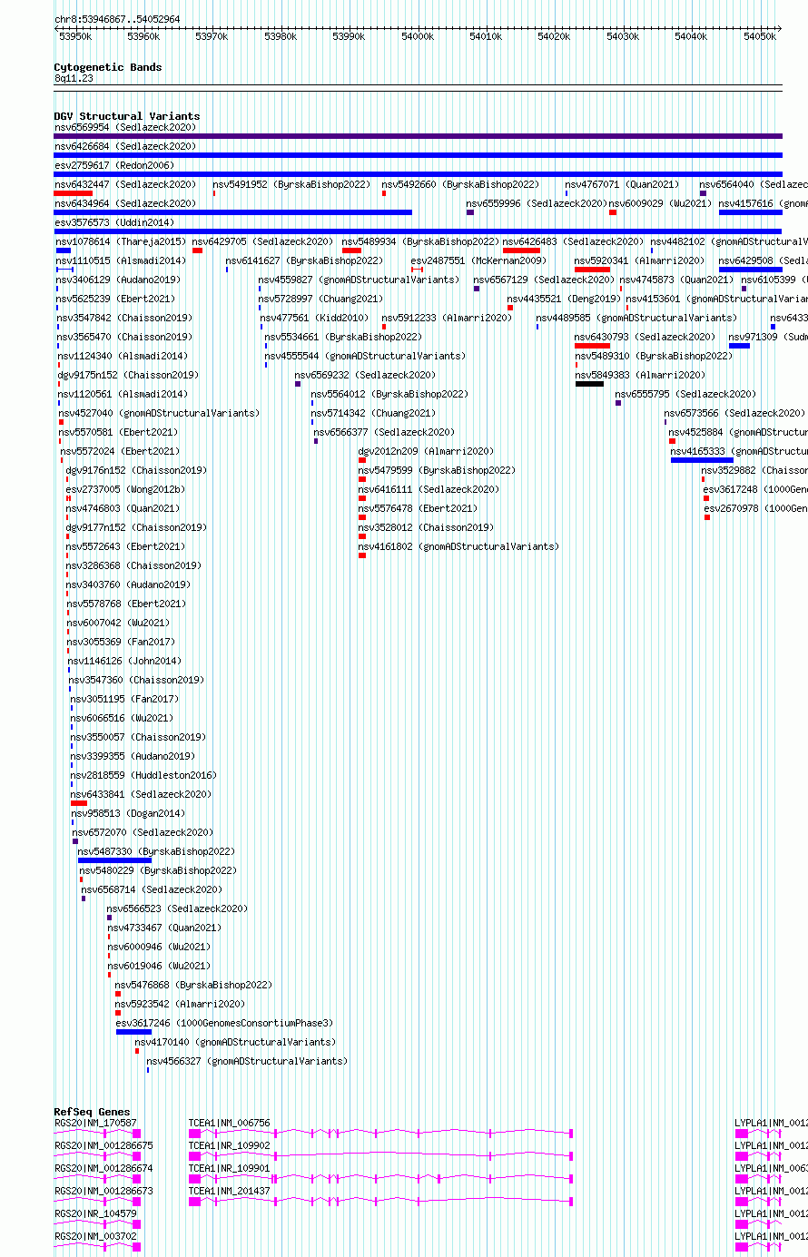 Variant DetailsVariant: esv3576573| Internal ID | 18704771 | | Landmark | | | Location Information | | | Cytoband | 8q11.23 | | Allele length | | Assembly | Allele length | | hg38 | 106098 | | hg19 | 106098 |
