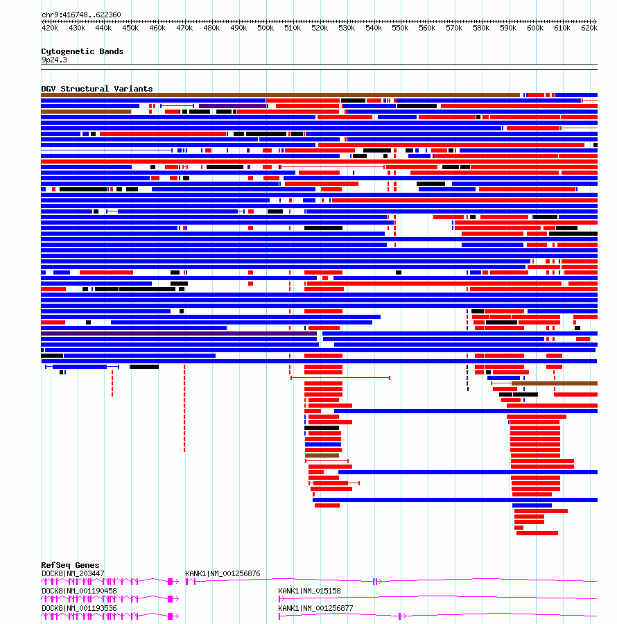 | | Variant Type | CNV gain | | Copy Number | | | Allele State | | | Allele Origin | | | Probe Count | | | Validation Flag | | | Merged Status | M | | Merged Variants | | | Supporting Variants | essv9790065 | | Samples | 401176BD | | Known Genes | DOCK8, KANK1 | | Method | SNP array | | Analysis | We used four separate algorithms to detect CNVs; Affymetrix Chromosome Analysis Suite (ChAS), iPattern, Nexus and Partek. Our primary analysis was performed based on ChAS CNV calls, which were then supported using the remaining three algorithms to construct a confidence set of CNVs. For all algorithms, we have used 8 probes and >1kb as a base line cutoff for CNV detection. | | Platform | Affymetrix CytoScan HD 2.7M array | | Comments | | | Reference | Uddin_et_al_2014 | | Pubmed ID | 25503493 | | Accession Number(s) | esv3576615