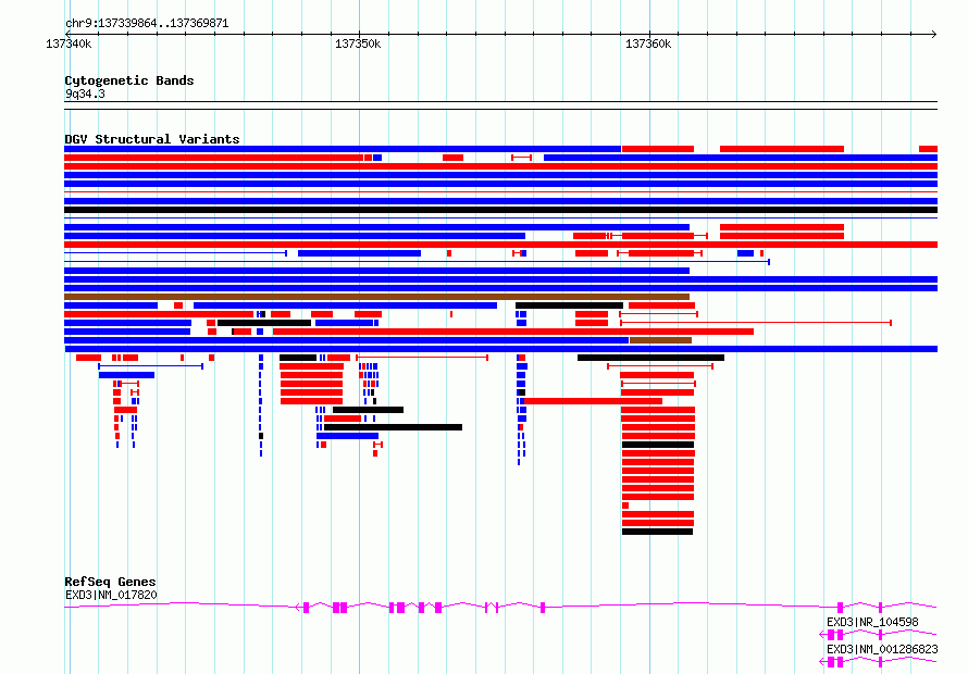 | | Variant Type | CNV gain | | Copy Number | | | Allele State | | | Allele Origin | | | Probe Count | | | Validation Flag | | | Merged Status | M | | Merged Variants | dgv2190e212 | | Supporting Variants | essv9791904, essv9791905, essv9791902, essv9791906, essv9791903 | | Samples | 402033WD, 401623SN, 400639RP, 400454RE, 401781SL | | Known Genes | EXD3 | | Method | SNP array | | Analysis | We used four separate algorithms to detect CNVs; Affymetrix Chromosome Analysis Suite (ChAS), iPattern, Nexus and Partek. Our primary analysis was performed based on ChAS CNV calls, which were then supported using the remaining three algorithms to construct a confidence set of CNVs. For all algorithms, we have used 8 probes and >1kb as a base line cutoff for CNV detection. | | Platform | Affymetrix CytoScan HD 2.7M array | | Comments | | | Reference | Uddin_et_al_2014 | | Pubmed ID | 25503493 | | Accession Number(s) | esv3576719