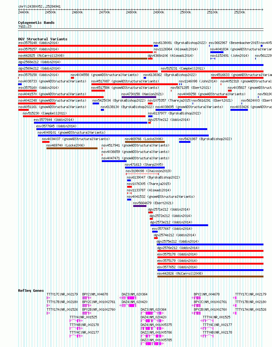 | | Variant Type | CNV gain | | Copy Number | | | Allele State | | | Allele Origin | | | Probe Count | | | Validation Flag | | | Merged Status | M | | Merged Variants | dgv2568e212 | | Supporting Variants | essv9834546 | | Samples | 401804FG | | Known Genes | BPY2, BPY2B, BPY2C, DAZ2, DAZ3, DAZ4, TTTY17A, TTTY17B, TTTY17C, TTTY4, TTTY4B, TTTY4C | | Method | SNP array | | Analysis | We used four separate algorithms to detect CNVs; Affymetrix Chromosome Analysis Suite (ChAS), iPattern, Nexus and Partek. Our primary analysis was performed based on ChAS CNV calls, which were then supported using the remaining three algorithms to construct a confidence set of CNVs. For all algorithms, we have used 8 probes and >1kb as a base line cutoff for CNV detection. | | Platform | Affymetrix CytoScan HD 2.7M array | | Comments | | | Reference | Uddin_et_al_2014 | | Pubmed ID | 25503493 | | Accession Number(s) | esv3577643