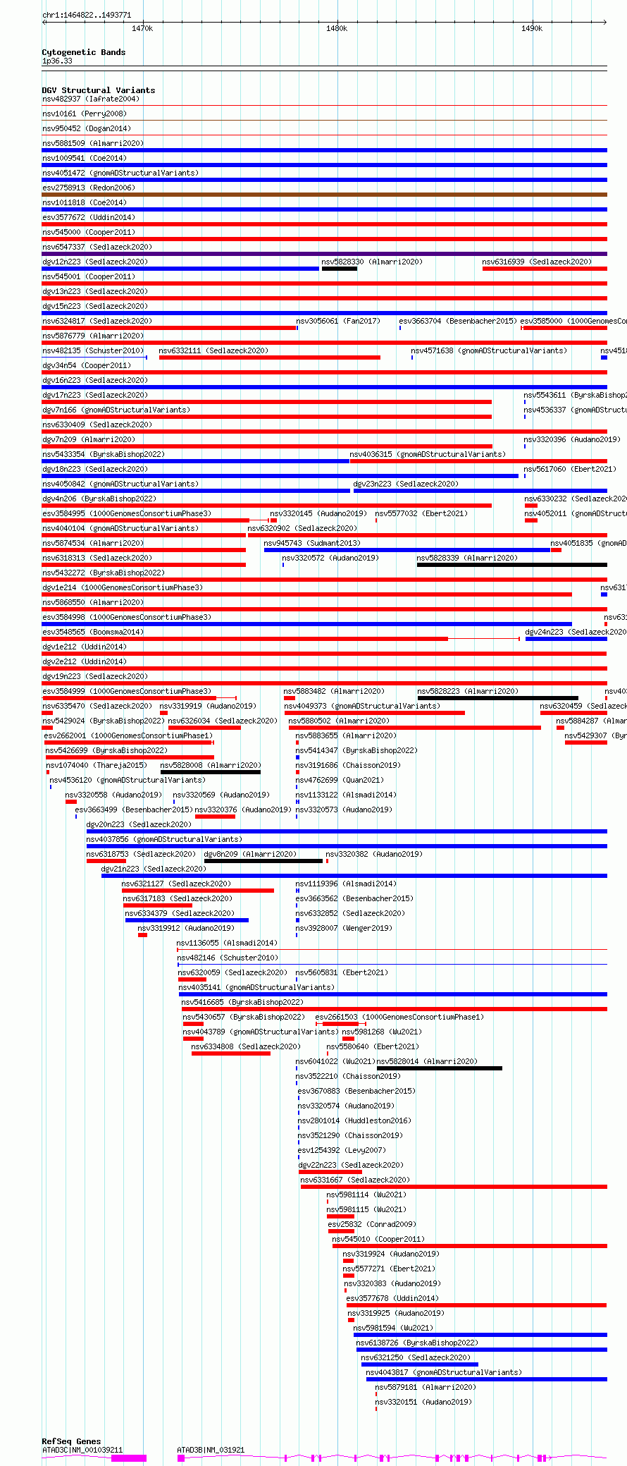 Variant DetailsVariant: esv3577667| Internal ID | 18705865 | | Landmark | | | Location Information | | | Cytoband | 1p36.33 | | Allele length | | Assembly | Allele length | | hg38 | 28950 | | hg19 | 28950 |