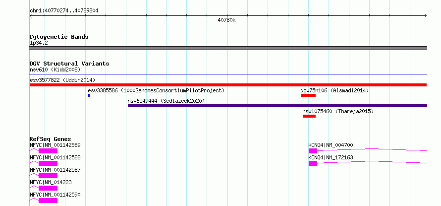 | | Variant Type | CNV loss | | Copy Number | | | Allele State | | | Allele Origin | | | Probe Count | | | Validation Flag | | | Merged Status | M | | Merged Variants | | | Supporting Variants | essv9835543, essv9835554, essv9835421, essv9835576, essv9835532, essv9835465, essv9835488, essv9835443, essv9835510, essv9835432, essv9835499, essv9835565, essv9835476, essv9835454, essv9835521 | | Samples | 400316SL, 400926LJ, 400641WJ, 400882DD, 400203NA, 400582WS, 401477ST, 400064WJ, 401879HJ, 401608GE, 401786WD, 401858TP, 401100SJ, 402042BJ, 400532MH | | Known Genes | KCNQ4, NFYC | | Method | SNP array | | Analysis | We used four separate algorithms to detect CNVs; Affymetrix Chromosome Analysis Suite (ChAS), iPattern, Nexus and Partek. Our primary analysis was performed based on ChAS CNV calls, which were then supported using the remaining three algorithms to construct a confidence set of CNVs. For all algorithms, we have used 8 probes and >1kb as a base line cutoff for CNV detection. | | Platform | Affymetrix CytoScan HD 2.7M array | | Comments | | | Reference | Uddin_et_al_2014 | | Pubmed ID | 25503493 | | Accession Number(s) | esv3577822