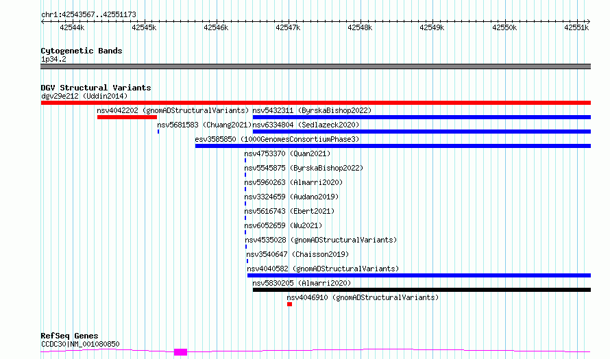 Variant DetailsVariant: esv3577826 | Internal ID | 18706024 | | Landmark | | | Location Information | | | Cytoband | 1p34.2 | | Allele length | | Assembly | Allele length | | hg38 | 7607 | | hg19 | 7607 |