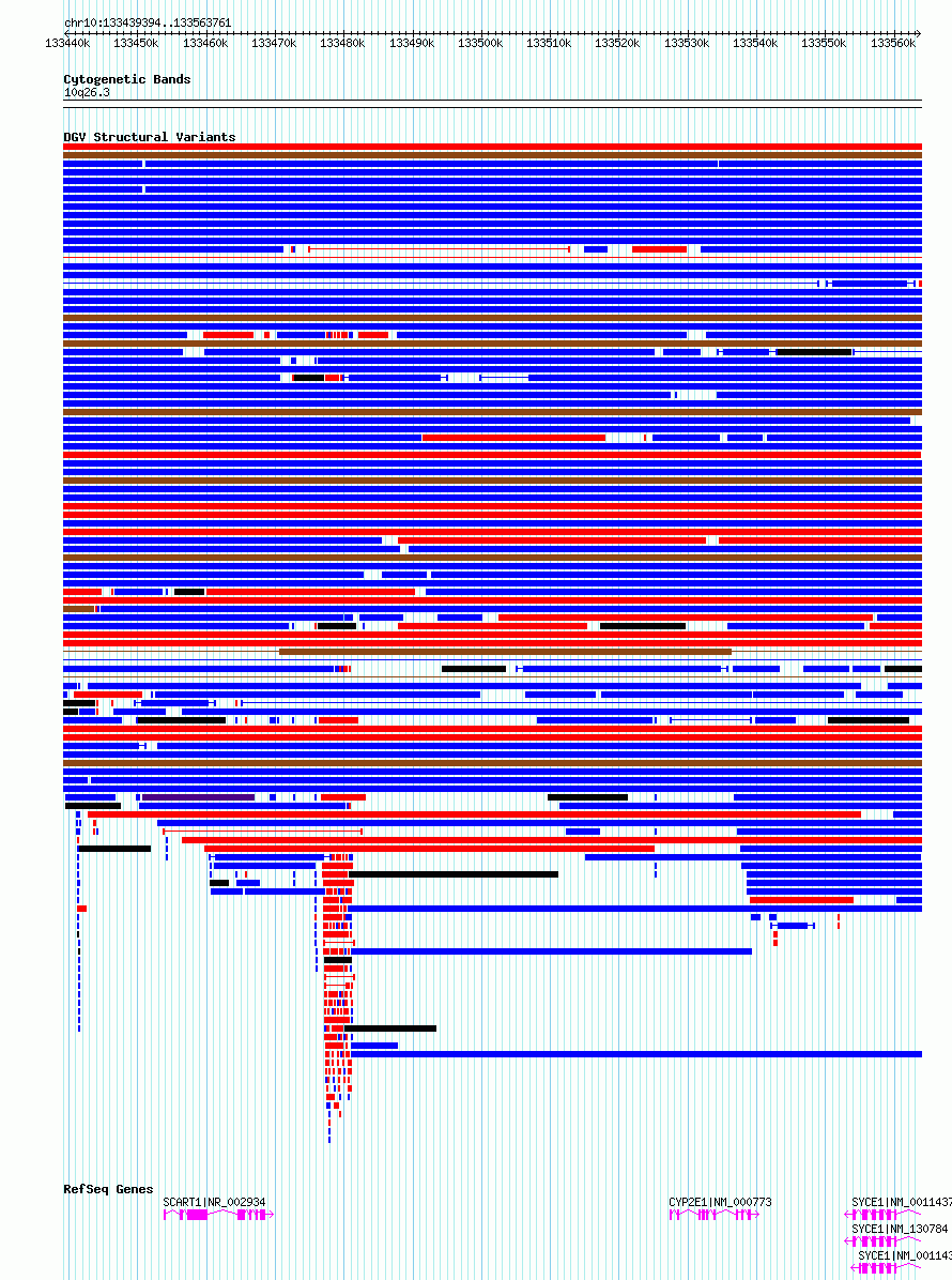 | | Variant Type | CNV gain | | Copy Number | | | Allele State | | | Allele Origin | | | Probe Count | | | Validation Flag | | | Merged Status | M | | Merged Variants | dgv304e212 | | Supporting Variants | essv9795312, essv9795313, essv9795307, essv9795309, essv9795308 | | Samples | 400622SJ, 400523GB, 401239PR, 401017SC, 400451kh | | Known Genes | CYP2E1, SCART1, SYCE1 | | Method | SNP array | | Analysis | We used four separate algorithms to detect CNVs; Affymetrix Chromosome Analysis Suite (ChAS), iPattern, Nexus and Partek. Our primary analysis was performed based on ChAS CNV calls, which were then supported using the remaining three algorithms to construct a confidence set of CNVs. For all algorithms, we have used 8 probes and >1kb as a base line cutoff for CNV detection. | | Platform | Affymetrix CytoScan HD 2.7M array | | Comments | | | Reference | Uddin_et_al_2014 | | Pubmed ID | 25503493 | | Accession Number(s) | esv3577928