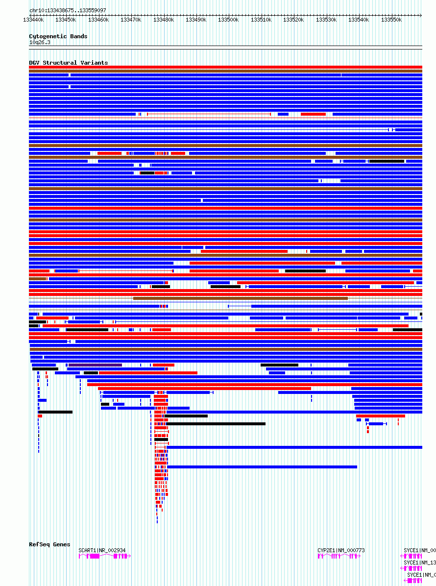 Variant DetailsVariant: esv3577950| Internal ID | 18706148 | | Landmark | | | Location Information | | | Cytoband | 10q26.3 | | Allele length | | Assembly | Allele length | | hg38 | 120423 | | hg19 | 120423 |