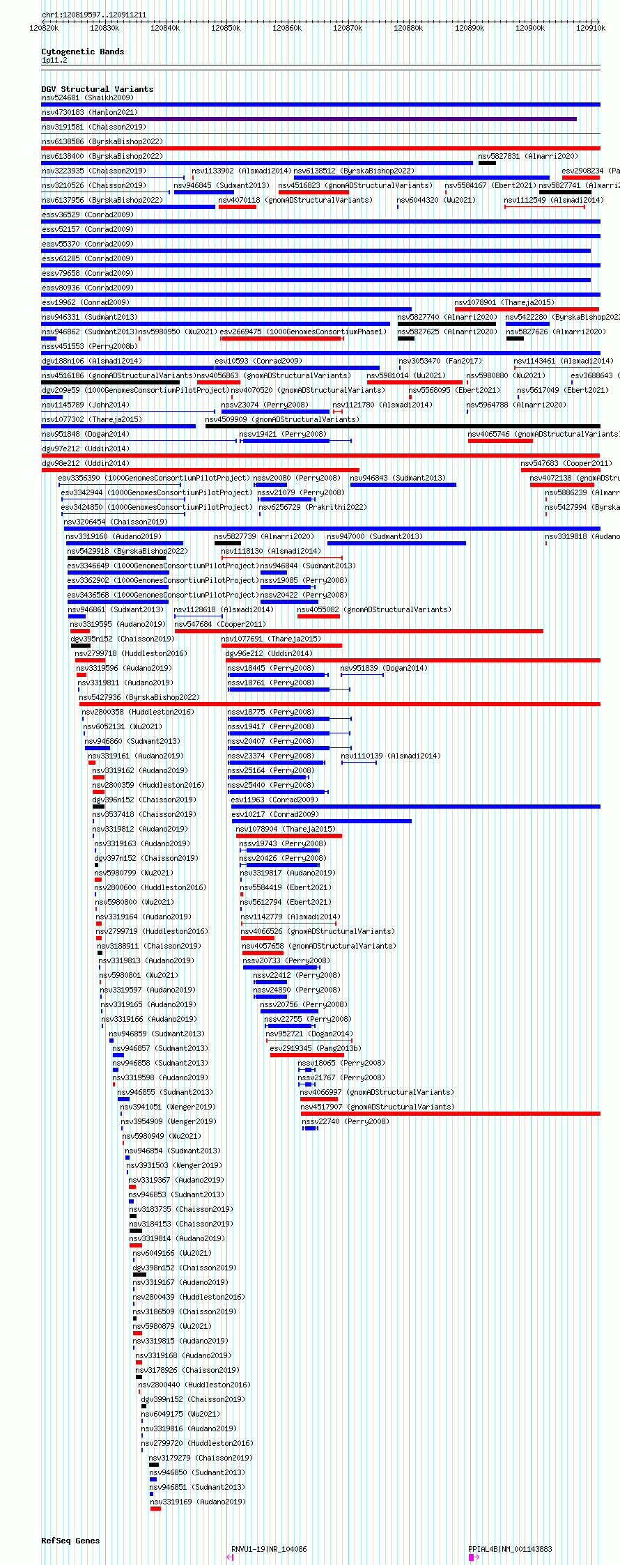 Variant DetailsVariant: esv3578156| Internal ID | 18706354 | | Landmark | | | Location Information | | | Cytoband | 1q21.2 | | Allele length | | Assembly | Allele length | | hg38 | 91615 | | hg19 | 86182 |