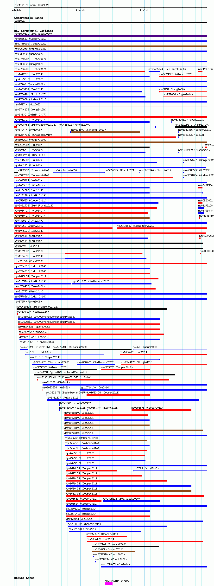 Variant DetailsVariant: esv3578361| Internal ID | 18706559 | | Landmark | | | Location Information | | | Cytoband | 11p15.1 | | Allele length | | Assembly | Allele length | | hg38 | 30171 | | hg19 | 30171 |