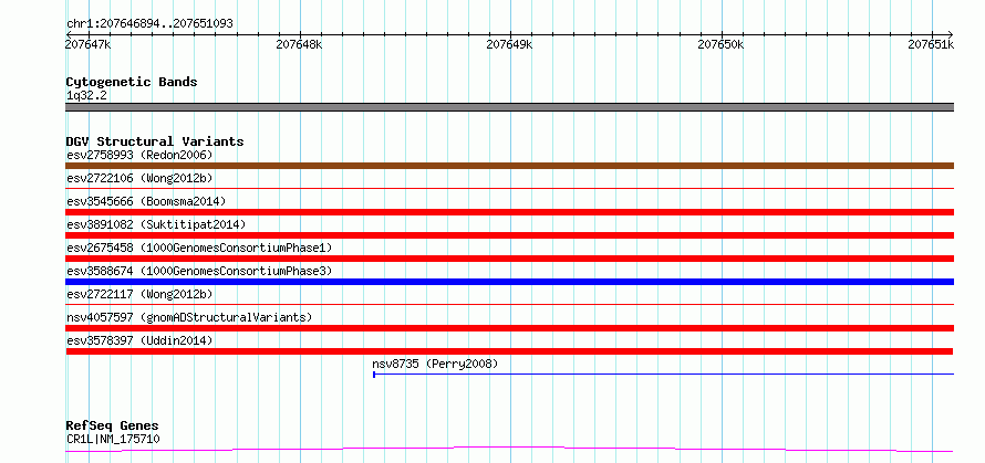 | | Variant Type | CNV loss | | Copy Number | | | Allele State | | | Allele Origin | | | Probe Count | | | Validation Flag | | | Merged Status | M | | Merged Variants | | | Supporting Variants | essv9804767, essv9804756, essv9804722, essv9804733, essv9804744 | | Samples | 401721CP, 401500OM, 400738WM, 401119DK, 400271SR | | Known Genes | CR1L | | Method | SNP array | | Analysis | We used four separate algorithms to detect CNVs; Affymetrix Chromosome Analysis Suite (ChAS), iPattern, Nexus and Partek. Our primary analysis was performed based on ChAS CNV calls, which were then supported using the remaining three algorithms to construct a confidence set of CNVs. For all algorithms, we have used 8 probes and >1kb as a base line cutoff for CNV detection. | | Platform | Affymetrix CytoScan HD 2.7M array | | Comments | | | Reference | Uddin_et_al_2014 | | Pubmed ID | 25503493 | | Accession Number(s) | esv3578397