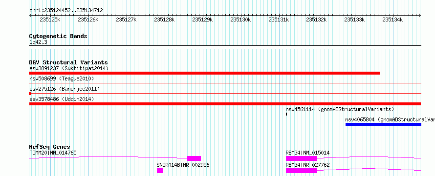 | | Variant Type | CNV loss | | Copy Number | | | Allele State | | | Allele Origin | | | Probe Count | | | Validation Flag | | | Merged Status | M | | Merged Variants | | | Supporting Variants | essv9807833, essv9807778, essv9807878, essv9807721, essv9807666, essv9807811, essv9807800, essv9807644, essv9807699, essv9807655, essv9807855, essv9807867, essv9807677, essv9807632, essv9807743, essv9807688, essv9807710, essv9807756, essv9807844, essv9807732, essv9807822, essv9807767, essv9807789 | | Samples | 401706BJ, 401460LW, 401498HH, 400956AM, 401036WS, 400272AE, 400995MS, 400852WJ, 401402EN, 401551MB, 400528LR, 401214BJ, 400038CK, 401589HP, 400768MN, 401618HR, 400047DS, 400248JO, 401496SL, 401265CB, 4000046CJ, 400243CK, 400782IE | | Known Genes | RBM34, SNORA14B, TOMM20 | | Method | SNP array | | Analysis | We used four separate algorithms to detect CNVs; Affymetrix Chromosome Analysis Suite (ChAS), iPattern, Nexus and Partek. Our primary analysis was performed based on ChAS CNV calls, which were then supported using the remaining three algorithms to construct a confidence set of CNVs. For all algorithms, we have used 8 probes and >1kb as a base line cutoff for CNV detection. | | Platform | Affymetrix CytoScan HD 2.7M array | | Comments | | | Reference | Uddin_et_al_2014 | | Pubmed ID | 25503493 | | Accession Number(s) | esv3578486
