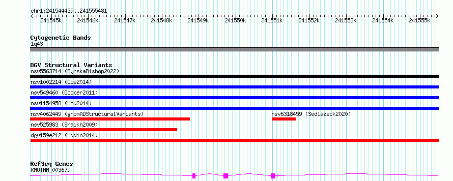 Variant DetailsVariant: esv3578510 | Internal ID | 18706708 | | Landmark | | | Location Information | | | Cytoband | 1q43 | | Allele length | | Assembly | Allele length | | hg38 | 11043 | | hg19 | 11043 |