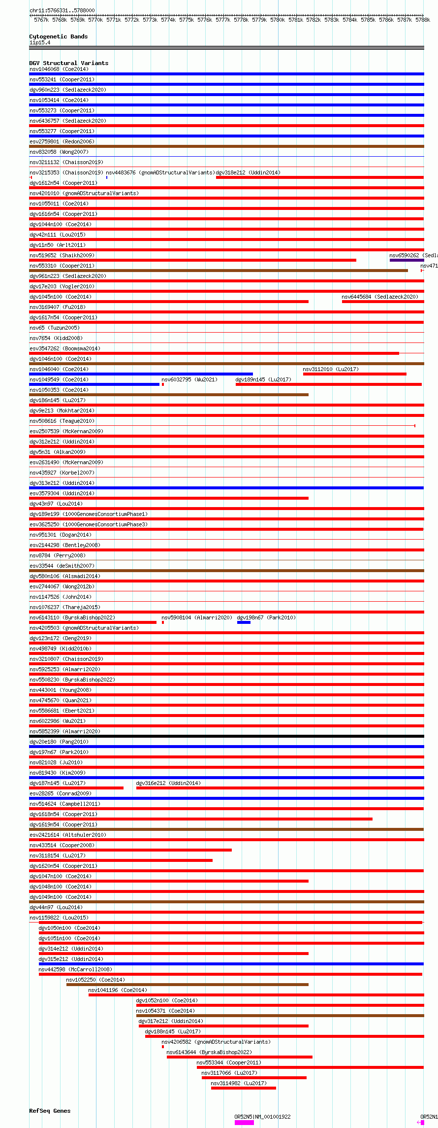 Variant DetailsVariant: esv3579287 | Internal ID | 18707485 | | Landmark | | | Location Information | | | Cytoband | 11p15.4 | | Allele length | | Assembly | Allele length | | hg38 | 21670 | | hg19 | 21670 |