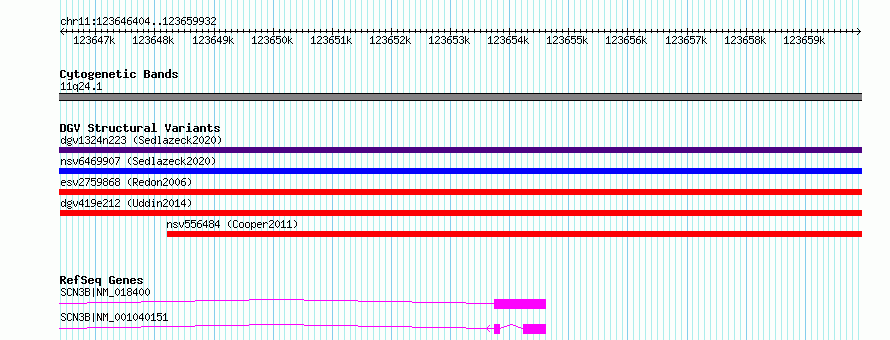 | | Variant Type | CNV loss | | Copy Number | | | Allele State | | | Allele Origin | | | Probe Count | | | Validation Flag | | | Merged Status | M | | Merged Variants | dgv419e212 | | Supporting Variants | essv9799046, essv9799048, essv9799042, essv9799039, essv9799043, essv9799050, essv9799047, essv9799041, essv9799045, essv9799051, essv9799049, essv9799040 | | Samples | 401721CP, 401602PR, 402016HZ, 401113MJ, 400882DD, 401303FM, 400211BJ, 400135DR, 401176BD, 400295PS, 400173KP, 400079AP | | Known Genes | SCN3B | | Method | SNP array | | Analysis | We used four separate algorithms to detect CNVs; Affymetrix Chromosome Analysis Suite (ChAS), iPattern, Nexus and Partek. Our primary analysis was performed based on ChAS CNV calls, which were then supported using the remaining three algorithms to construct a confidence set of CNVs. For all algorithms, we have used 8 probes and >1kb as a base line cutoff for CNV detection. | | Platform | Affymetrix CytoScan HD 2.7M array | | Comments | | | Reference | Uddin_et_al_2014 | | Pubmed ID | 25503493 | | Accession Number(s) | esv3579934