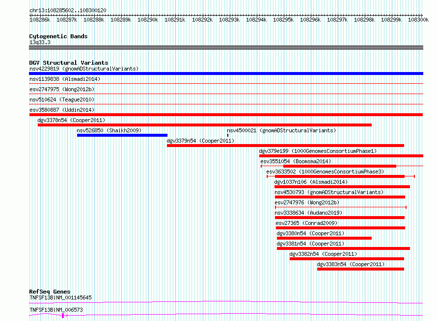 Variant DetailsVariant: esv3580887 | Internal ID | 18362399 | | Landmark | | | Location Information | | | Cytoband | 13q33.3 | | Allele length | | Assembly | Allele length | | hg38 | 14519 | | hg19 | 14519 |