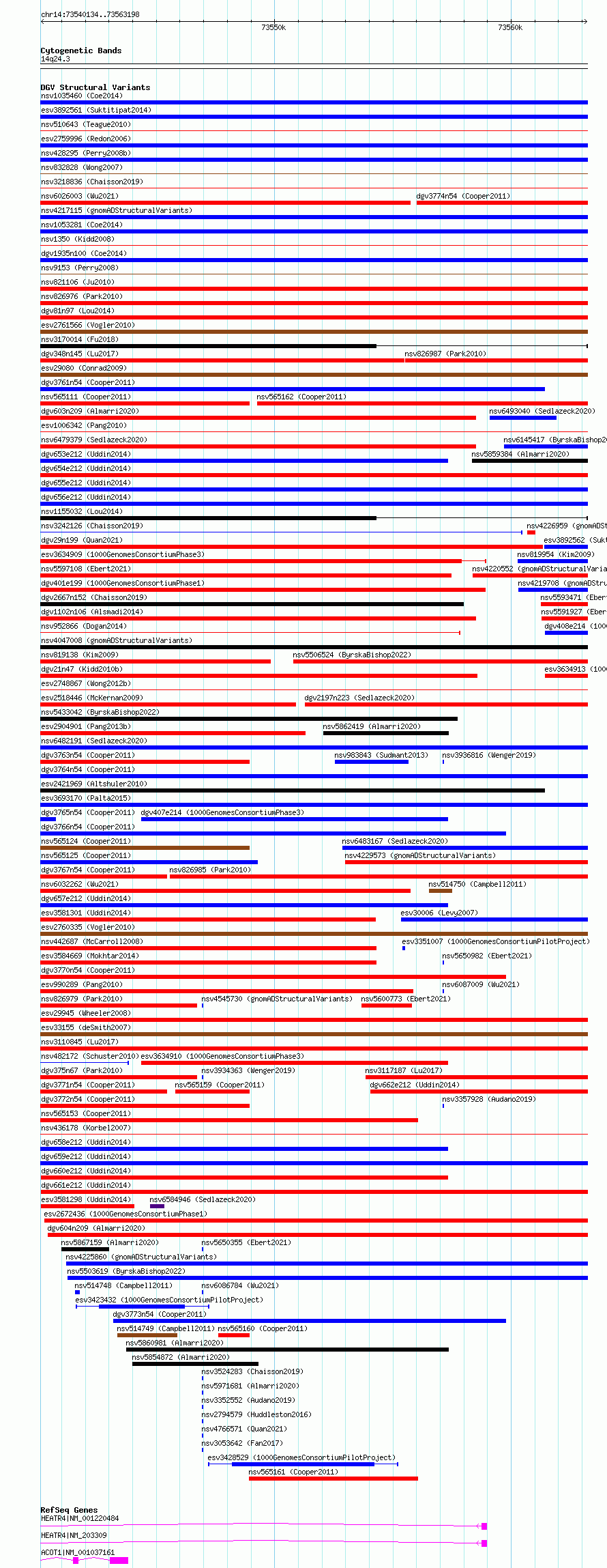 Variant DetailsVariant: esv3581292 | Internal ID | 18709490 | | Landmark | | | Location Information | | | Cytoband | 14q24.3 | | Allele length | | Assembly | Allele length | | hg38 | 23065 | | hg19 | 23065 |