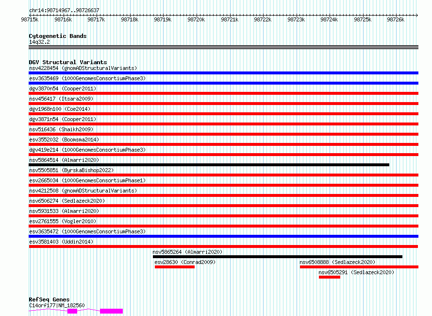 Variant DetailsVariant: esv3581403 | Internal ID | 18709601 | | Landmark | | | Location Information | | | Cytoband | 14q32.2 | | Allele length | | Assembly | Allele length | | hg38 | 11671 | | hg19 | 11671 |