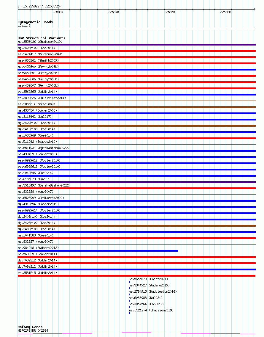 Variant DetailsVariant: esv3581515 | Internal ID | 18709713 | | Landmark | | | Location Information | | | Cytoband | 15q11.2 | | Allele length | | Assembly | Allele length | | hg38 | 4248 | | hg19 | 4248 |