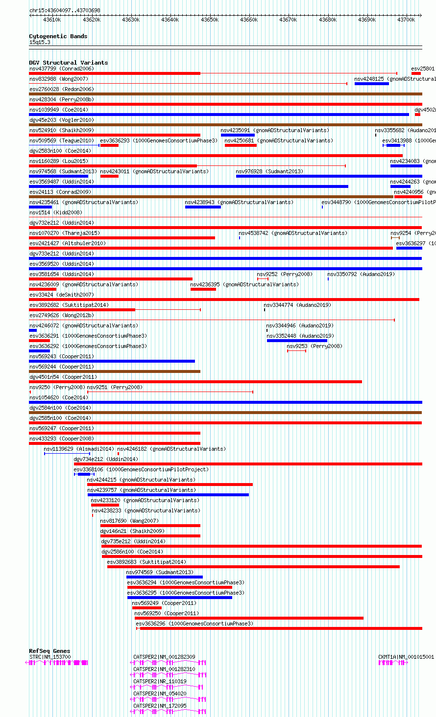 Variant DetailsVariant: esv3581658| Internal ID | 18363170 | | Landmark | | | Location Information | | | Cytoband | 15q15.3 | | Allele length | | Assembly | Allele length | | hg38 | 99602 | | hg19 | 99602 |