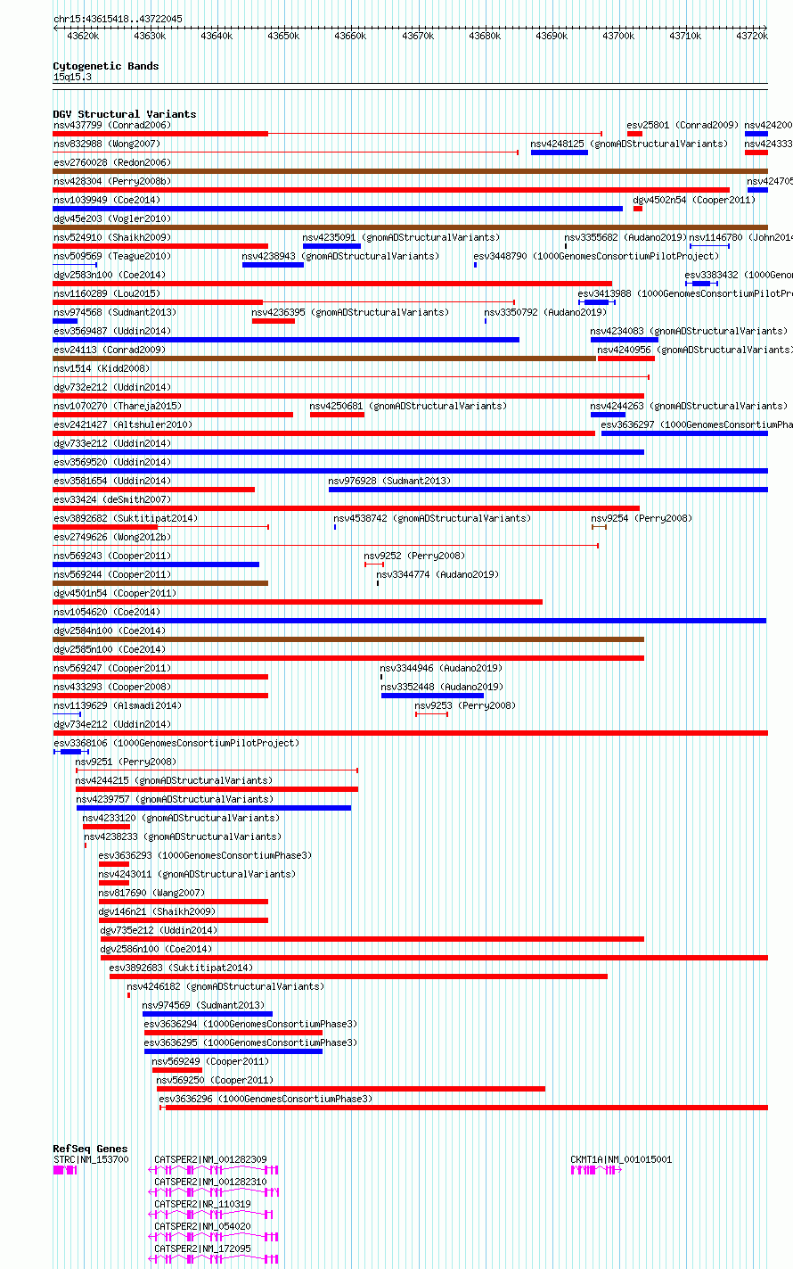 Variant DetailsVariant: esv3581659| Internal ID | 18363171 | | Landmark | | | Location Information | | | Cytoband | 15q15.3 | | Allele length | | Assembly | Allele length | | hg38 | 106628 | | hg19 | 106628 |