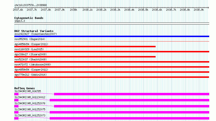 Variant DetailsVariant: esv3581934 | Internal ID | 18363446 | | Landmark | | | Location Information | | | Cytoband | 16p13.3 | | Allele length | | Assembly | Allele length | | hg38 | 1395 | | hg19 | 1395 |