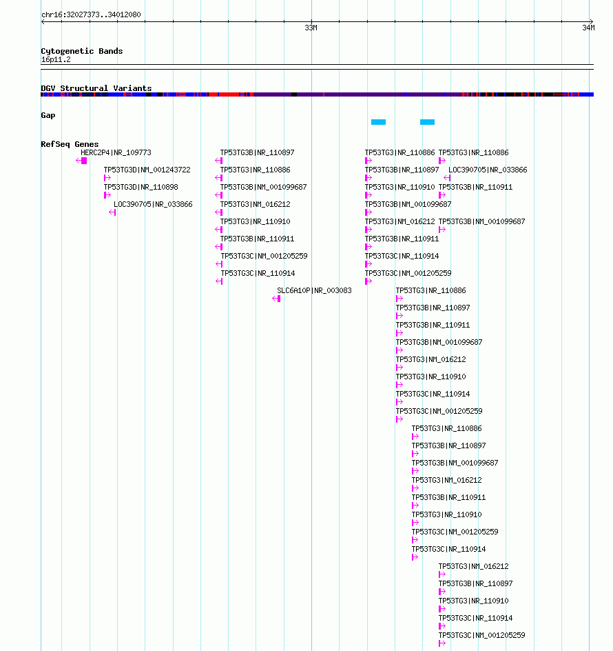 Variant DetailsVariant: esv3582159| Internal ID | 18710357 | | Landmark | | | Location Information | | | Cytoband | 16p11.2 | | Allele length | | Assembly | Allele length | | hg38 | 1984708 | | hg19 | 1775854 |
