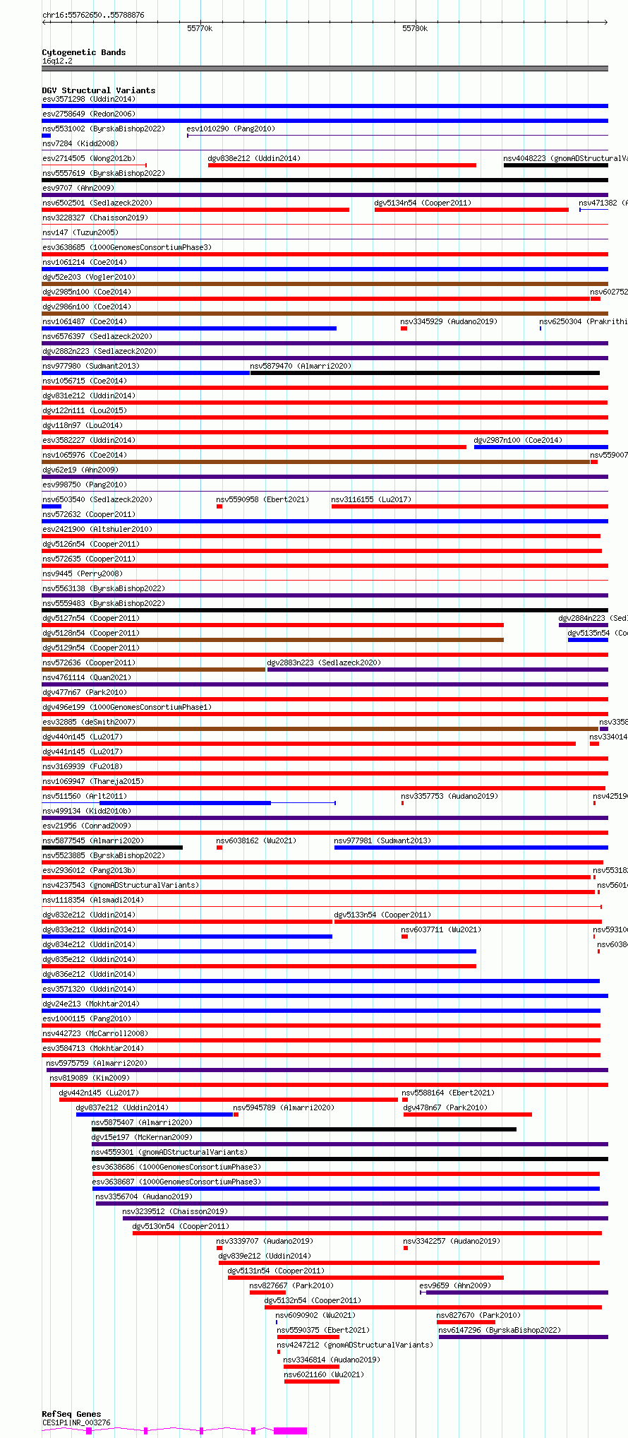 Variant DetailsVariant: esv3582218| Internal ID | 18710416 | | Landmark | | | Location Information | | | Cytoband | 16q12.2 | | Allele length | | Assembly | Allele length | | hg38 | 26227 | | hg19 | 26227 |
