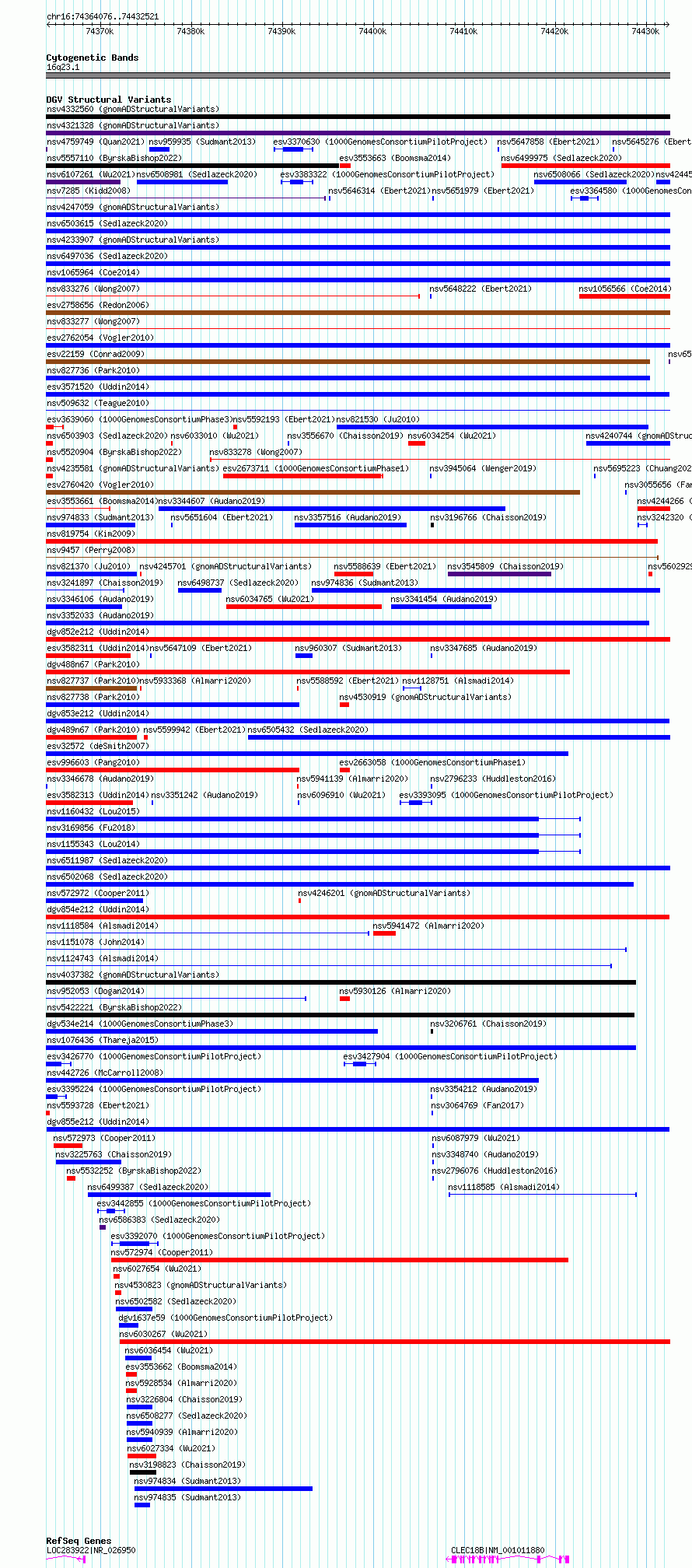 Variant DetailsVariant: esv3582303 | Internal ID | 18710501 | | Landmark | | | Location Information | | | Cytoband | 16q23.1 | | Allele length | | Assembly | Allele length | | hg38 | 68446 | | hg19 | 68446 |