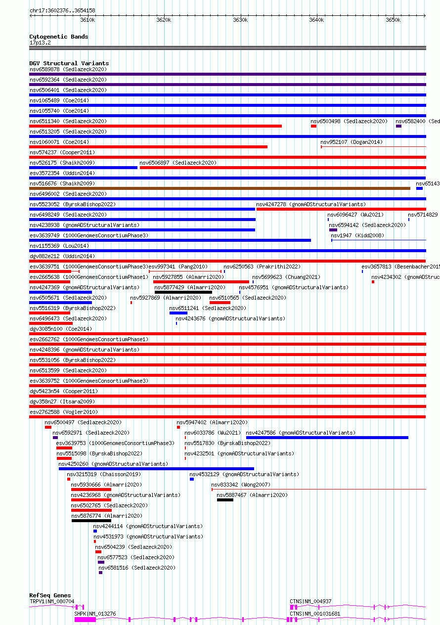 Variant DetailsVariant: esv3582493| Internal ID | 18710691 | | Landmark | | | Location Information | | | Cytoband | 17p13.2 | | Allele length | | Assembly | Allele length | | hg38 | 51783 | | hg19 | 51783 |