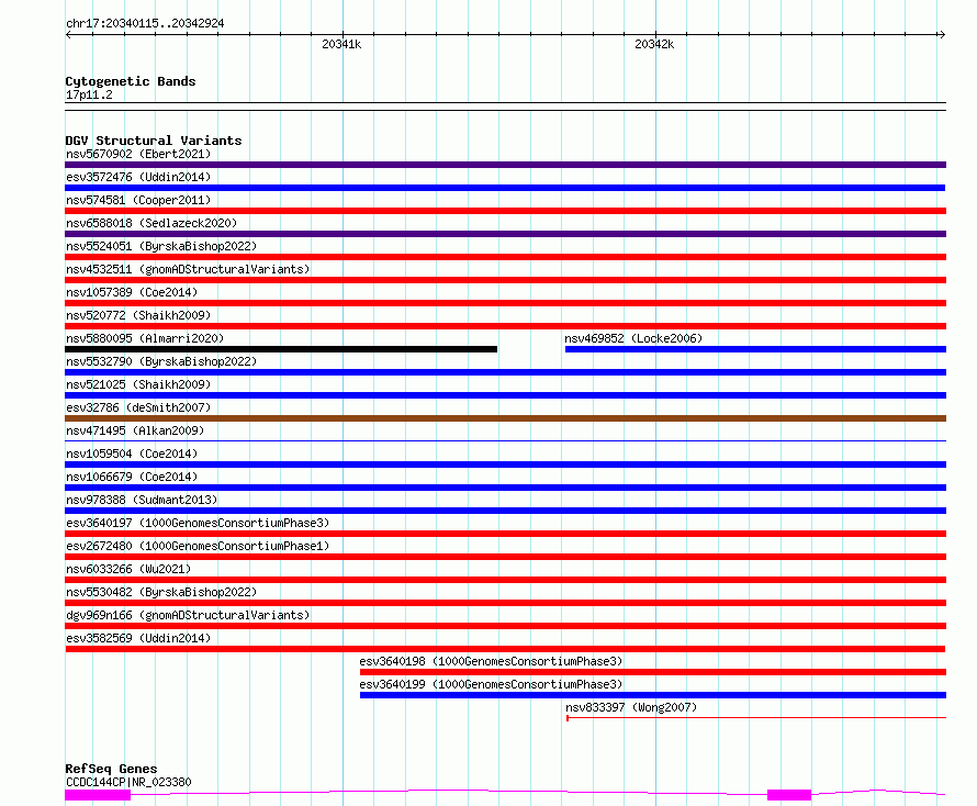 Variant DetailsVariant: esv3582569| Internal ID | 18710767 | | Landmark | | | Location Information | | | Cytoband | 17p11.2 | | Allele length | | Assembly | Allele length | | hg38 | 2810 | | hg19 | 2810 |