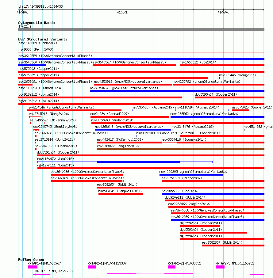 Variant DetailsVariant: esv3582651| Internal ID | 18364163 | | Landmark | | | Location Information | | | Cytoband | 17q21.2 | | Allele length | | Assembly | Allele length | | hg38 | 24422 | | hg19 | 24422 |