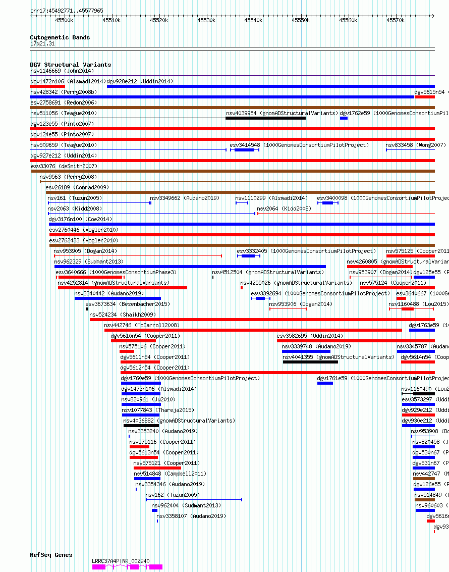 Variant DetailsVariant: esv3582679Internal ID | 18364191 | Landmark | | Location Information | | Cytoband | 17q21.31 | Allele length | Assembly | Allele length | hg38 | 85195 | hg19 | 85195 |