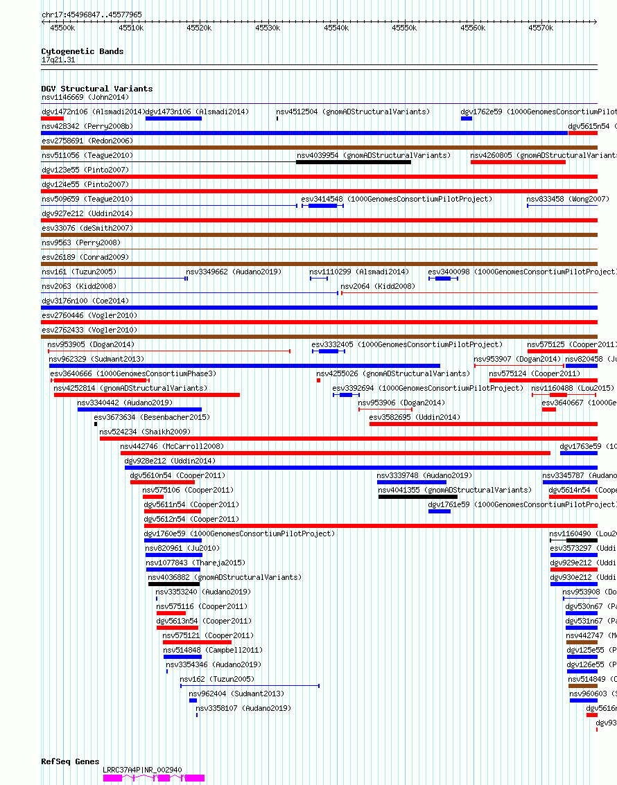 Variant DetailsVariant: esv3582680 Internal ID | 18364192 | Landmark | | Location Information | | Cytoband | 17q21.31 | Allele length | Assembly | Allele length | hg38 | 81119 | hg19 | 81119 |