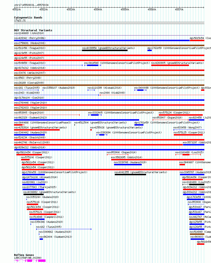 Variant DetailsVariant: esv3582689Internal ID | 18364201 | Landmark | | Location Information | | Cytoband | 17q21.31 | Allele length | Assembly | Allele length | hg38 | 70004 | hg19 | 70004 |