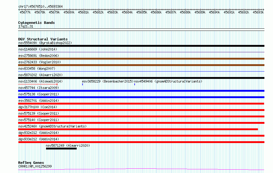 Variant DetailsVariant: esv3582696| Internal ID | 18710894 | | Landmark | | | Location Information | | | Cytoband | 17q21.31 | | Allele length | | Assembly | Allele length | | hg38 | 16855 | | hg19 | 16855 |