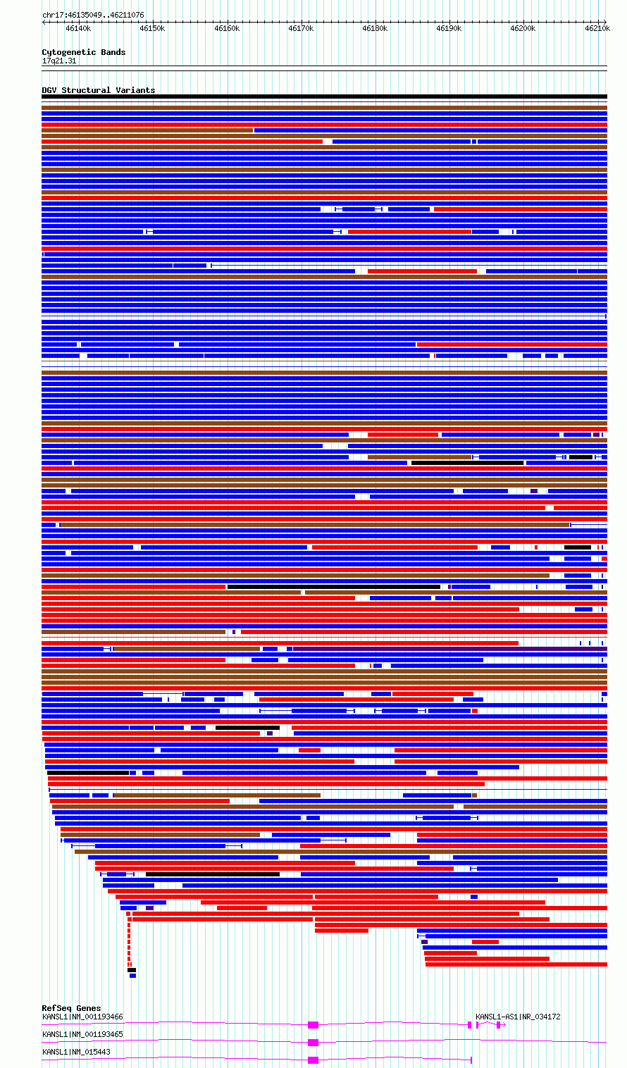Variant DetailsVariant: esv3582720| Internal ID | 18710918 | | Landmark | | | Location Information | | | Cytoband | 17q21.31 | | Allele length | | Assembly | Allele length | | hg38 | 76028 | | hg19 | 76028 |