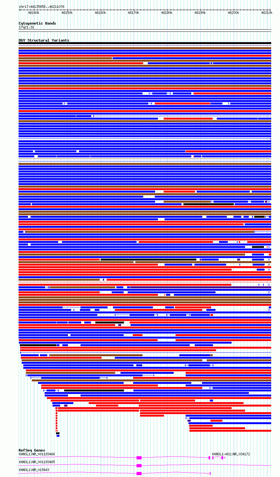 Variant DetailsVariant: esv3582737| Internal ID | 18710935 | | Landmark | | | Location Information | | | Cytoband | 17q21.31 | | Allele length | | Assembly | Allele length | | hg38 | 75619 | | hg19 | 75619 |