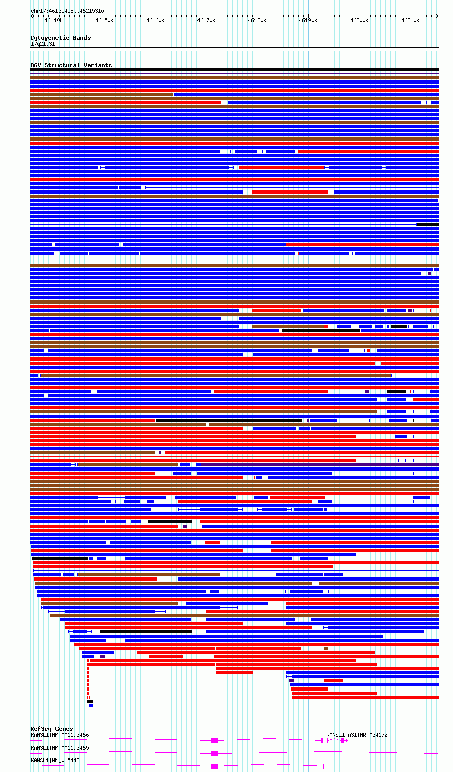 Variant DetailsVariant: esv3582742| Internal ID | 18710940 | | Landmark | | | Location Information | | | Cytoband | 17q21.31 | | Allele length | | Assembly | Allele length | | hg38 | 79853 | | hg19 | 79853 |