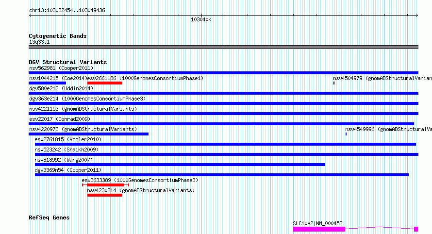 Variant DetailsVariant: esv3582771 | Internal ID | 18364283 | | Landmark | | | Location Information | | | Cytoband | 13q33.1 | | Allele length | | Assembly | Allele length | | hg38 | 16983 | | hg19 | 16983 |