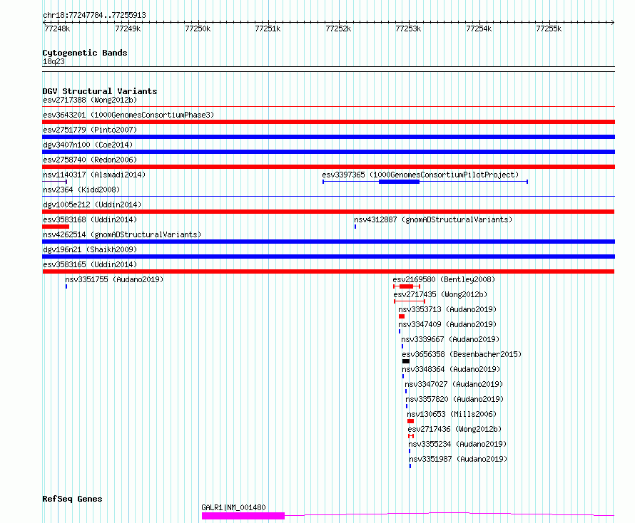 Variant DetailsVariant: esv3583165| Internal ID | 18364677 | | Landmark | | | Location Information | | | Cytoband | 18q23 | | Allele length | | Assembly | Allele length | | hg38 | 8130 | | hg19 | 8130 |
