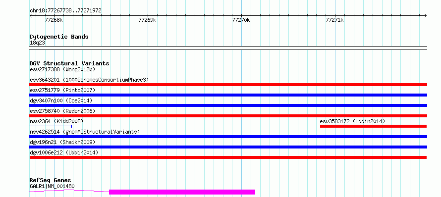 | | Variant Type | CNV loss | | Copy Number | | | Allele State | | | Allele Origin | | | Probe Count | | | Validation Flag | | | Merged Status | M | | Merged Variants | dgv1006e212 | | Supporting Variants | essv9816256, essv9816259, essv9816249, essv9816257, essv9816252, essv9816250, essv9816260, essv9816258, essv9816253, essv9816251, essv9816254 | | Samples | 401906DT, 400871CM, 401950MD, 401443JK, 401369GR, 40050SB, 401359HF, 400837HN, 400471YS, 400769SL, 401040KM | | Known Genes | GALR1 | | Method | SNP array | | Analysis | We used four separate algorithms to detect CNVs; Affymetrix Chromosome Analysis Suite (ChAS), iPattern, Nexus and Partek. Our primary analysis was performed based on ChAS CNV calls, which were then supported using the remaining three algorithms to construct a confidence set of CNVs. For all algorithms, we have used 8 probes and >1kb as a base line cutoff for CNV detection. | | Platform | Affymetrix CytoScan HD 2.7M array | | Comments | | | Reference | Uddin_et_al_2014 | | Pubmed ID | 25503493 | | Accession Number(s) | esv3583170