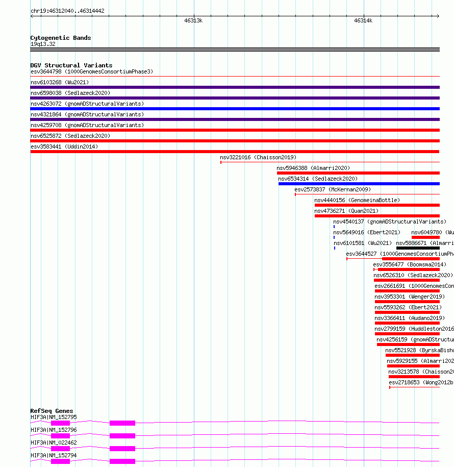 Variant DetailsVariant: esv3583441| Internal ID | 18711639 | | Landmark | | | Location Information | | | Cytoband | 19q13.32 | | Allele length | | Assembly | Allele length | | hg38 | 2403 | | hg19 | 2403 |