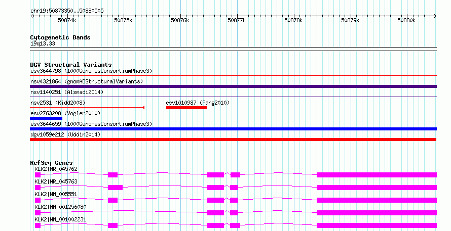 | | Variant Type | CNV loss | | Copy Number | | | Allele State | | | Allele Origin | | | Probe Count | | | Validation Flag | | | Merged Status | M | | Merged Variants | dgv1059e212 | | Supporting Variants | essv9817772, essv9817773 | | Samples | 401869BG, 401372RR | | Known Genes | KLK2 | | Method | SNP array | | Analysis | We used four separate algorithms to detect CNVs; Affymetrix Chromosome Analysis Suite (ChAS), iPattern, Nexus and Partek. Our primary analysis was performed based on ChAS CNV calls, which were then supported using the remaining three algorithms to construct a confidence set of CNVs. For all algorithms, we have used 8 probes and >1kb as a base line cutoff for CNV detection. | | Platform | Affymetrix CytoScan HD 2.7M array | | Comments | | | Reference | Uddin_et_al_2014 | | Pubmed ID | 25503493 | | Accession Number(s) | esv3583469