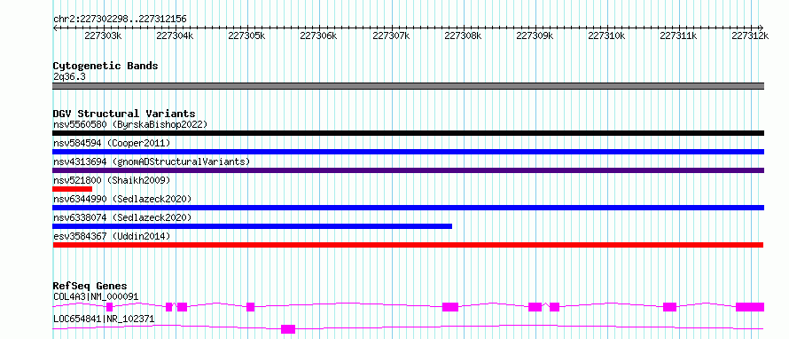 | | Variant Type | CNV loss | | Copy Number | | | Allele State | | | Allele Origin | | | Probe Count | | | Validation Flag | | | Merged Status | M | | Merged Variants | | | Supporting Variants | essv9837073, essv9837074 | | Samples | 401368WR, 400474GF | | Known Genes | COL4A3, LOC654841 | | Method | SNP array | | Analysis | We used four separate algorithms to detect CNVs; Affymetrix Chromosome Analysis Suite (ChAS), iPattern, Nexus and Partek. Our primary analysis was performed based on ChAS CNV calls, which were then supported using the remaining three algorithms to construct a confidence set of CNVs. For all algorithms, we have used 8 probes and >1kb as a base line cutoff for CNV detection. | | Platform | Affymetrix CytoScan HD 2.7M array | | Comments | | | Reference | Uddin_et_al_2014 | | Pubmed ID | 25503493 | | Accession Number(s) | esv3584367