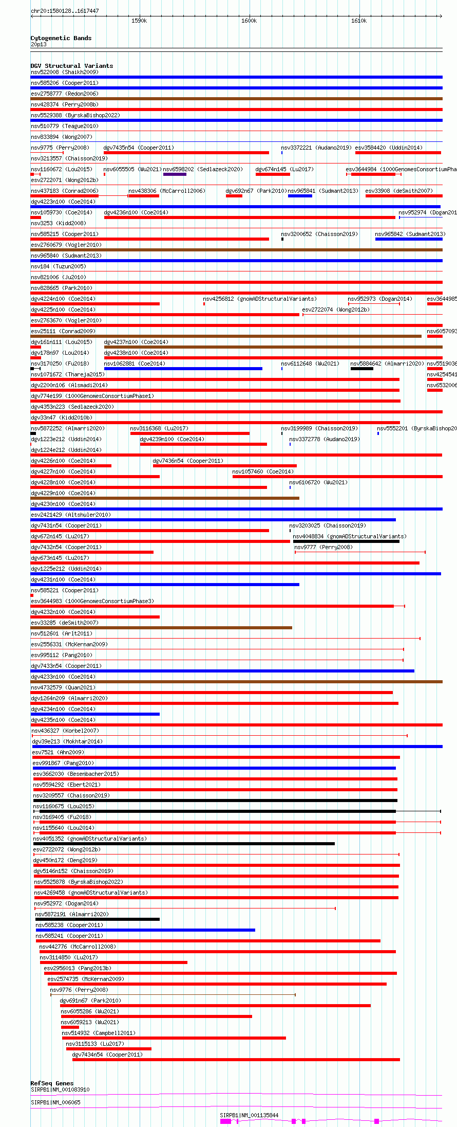 Variant DetailsVariant: esv3584411 | Internal ID | 18712609 | | Landmark | | | Location Information | | | Cytoband | 20p13 | | Allele length | | Assembly | Allele length | | hg38 | 37320 | | hg19 | 37320 |