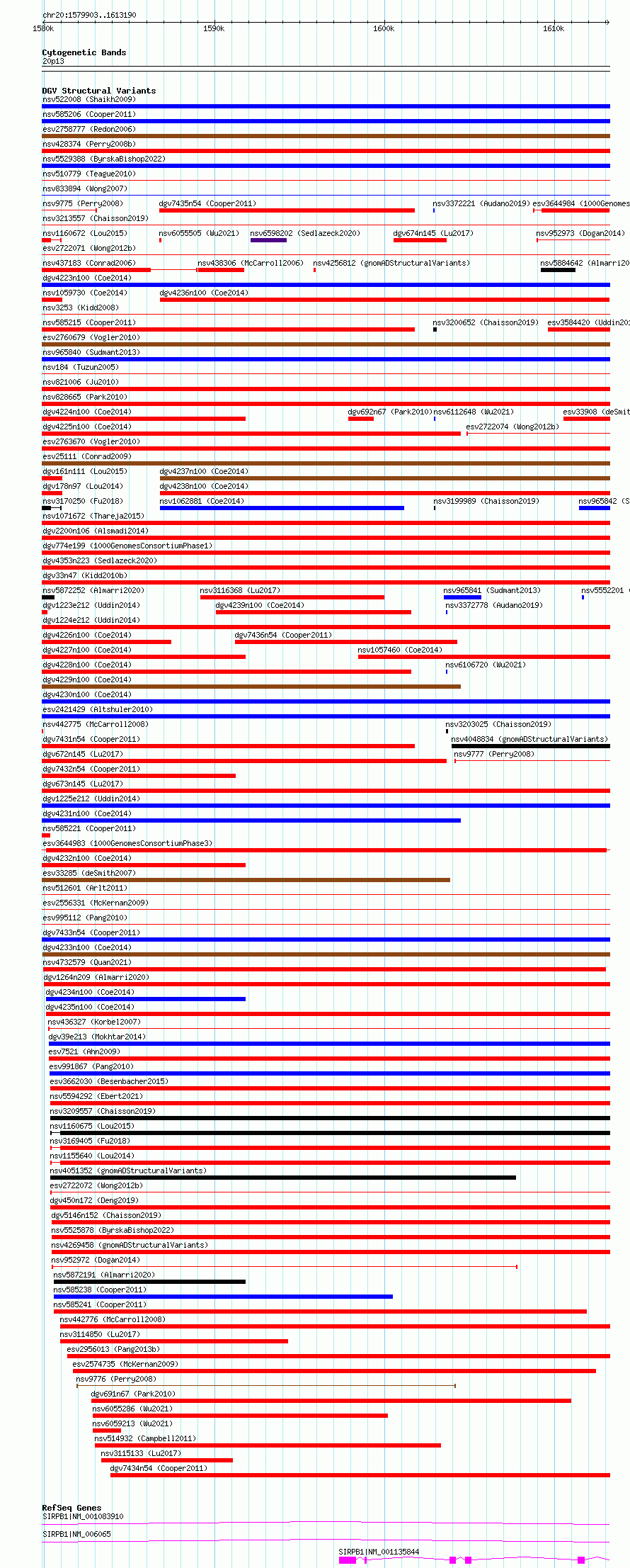 Variant DetailsVariant: esv3584416| Internal ID | 18712614 | | Landmark | | | Location Information | | | Cytoband | 20p13 | | Allele length | | Assembly | Allele length | | hg38 | 33288 | | hg19 | 33288 |