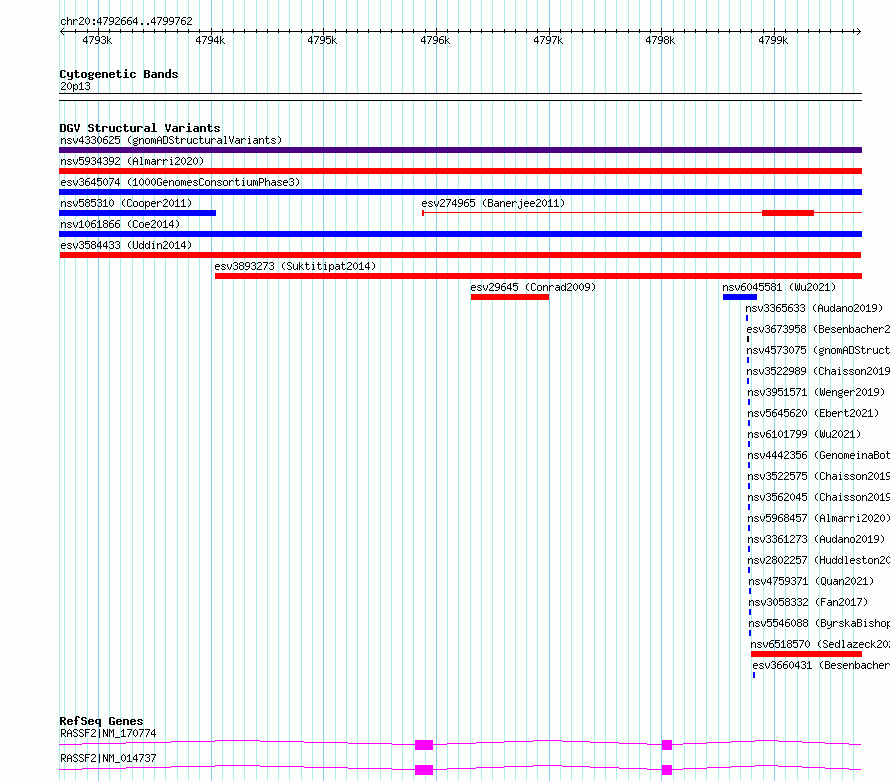 Variant DetailsVariant: esv3584433| Internal ID | 18712631 | | Landmark | | | Location Information | | | Cytoband | 20p13 | | Allele length | | Assembly | Allele length | | hg38 | 7099 | | hg19 | 7099 |