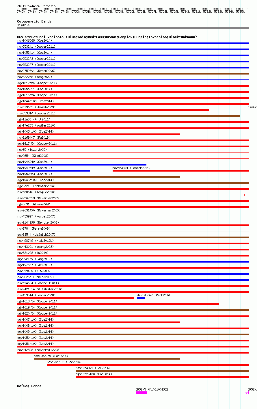 Variant DetailsVariant: esv3584629| Internal ID | 18770099 | | Landmark | | | Location Information | | | Cytoband | 11p15.4 | | Allele length | | Assembly | Allele length | | hg38 | 21060 | | hg19 | 21060 | | hg18 | 21060 |