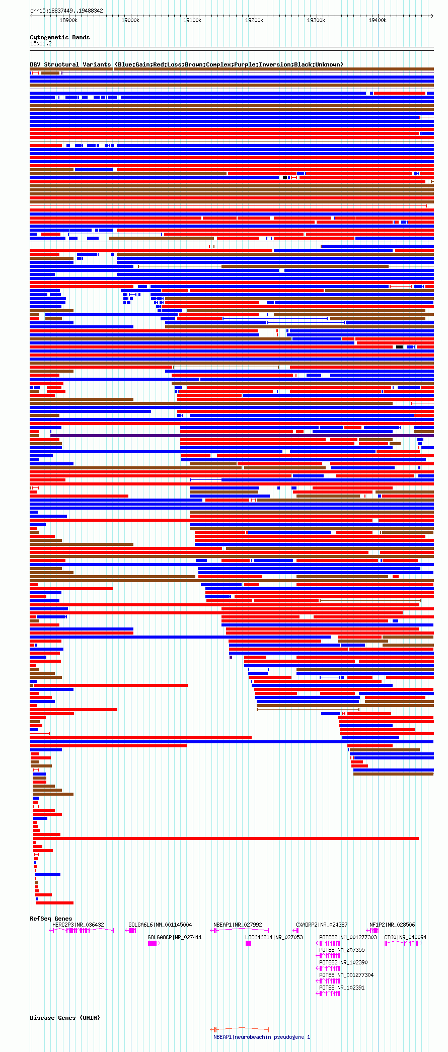 Variant DetailsVariant: esv3584832| Internal ID | 18770302 | | Landmark | | | Location Information | | | Cytoband | 15q11.1 | | Allele length | | Assembly | Allele length | | hg38 | 646173 | | hg19 | 646249 | | hg18 | 650894 |