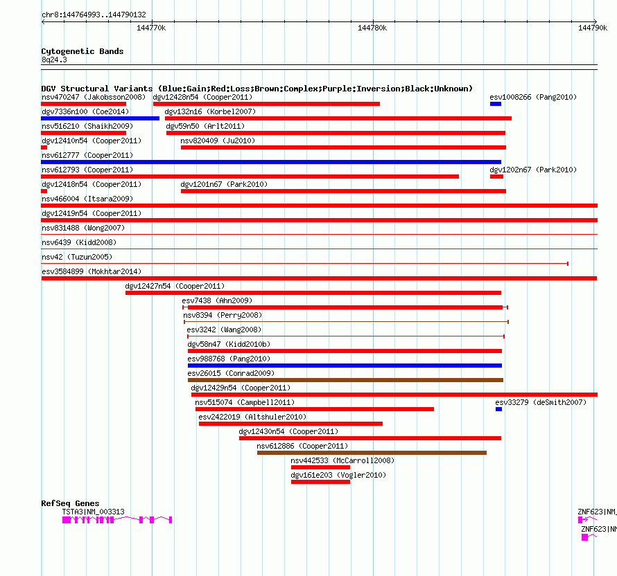 Variant DetailsVariant: esv3584899| Internal ID | 18423683 | | Landmark | | | Location Information | | | Cytoband | 8q24.3 | | Allele length | | Assembly | Allele length | | hg38 | 25140 | | hg19 | 25140 | | hg18 | 25140 |